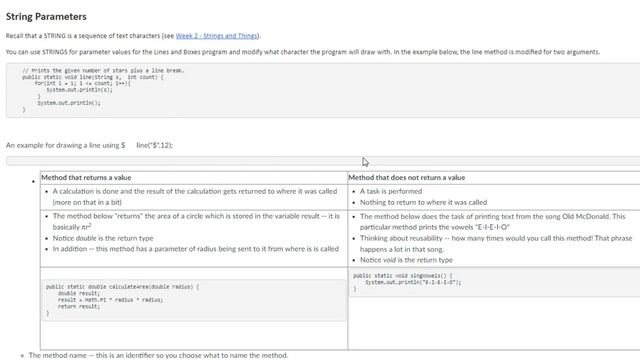 Calling Java methods that have a return type other than void. Adding parameters and how to call the method with parameters. Overloading. Method signatures.