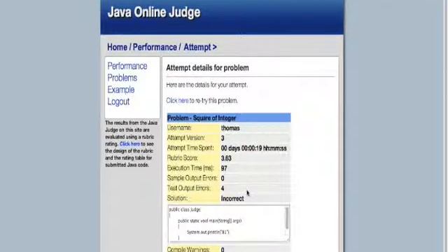 The project's front-end requirements are implemented in PHP with mySQL running on a Linux server. The Java Judge is created as a threaded Java socket server which accepts Java code and completes the required tests on the Java code and responds with the required test results.
