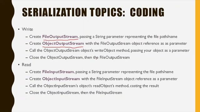 In earlier programming courses, students have typically learned to read and write data from text files; that gets onerous when we're trying to focus on other projects with substantial data. In this video, we learn about a new way to write data, asking Java to write an entire object (along with its "has a" related objects) to a file in one step. Follow-up videos will discuss Deserialization and how versioning works.