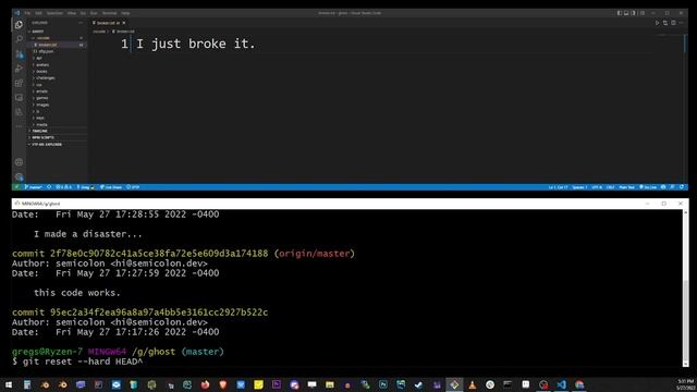 01:34 undo last commit using git reset hard head (and caret character)