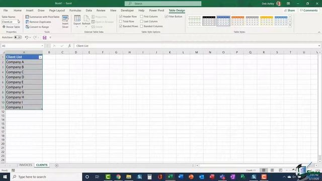 In this example, I am using a spreadsheet that has been set up to log invoice details. I have created a data validation drop-down list to show the list of clients. Selecting a client from the list as opposed to manually typing it into the cell, is a lot more accurate and efficient.